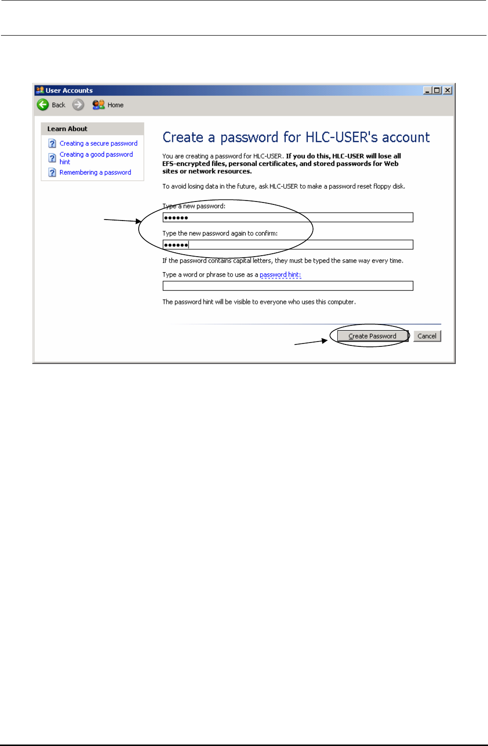 a new Password] and [Type the new Password again to confirm] fields, and click the [Create