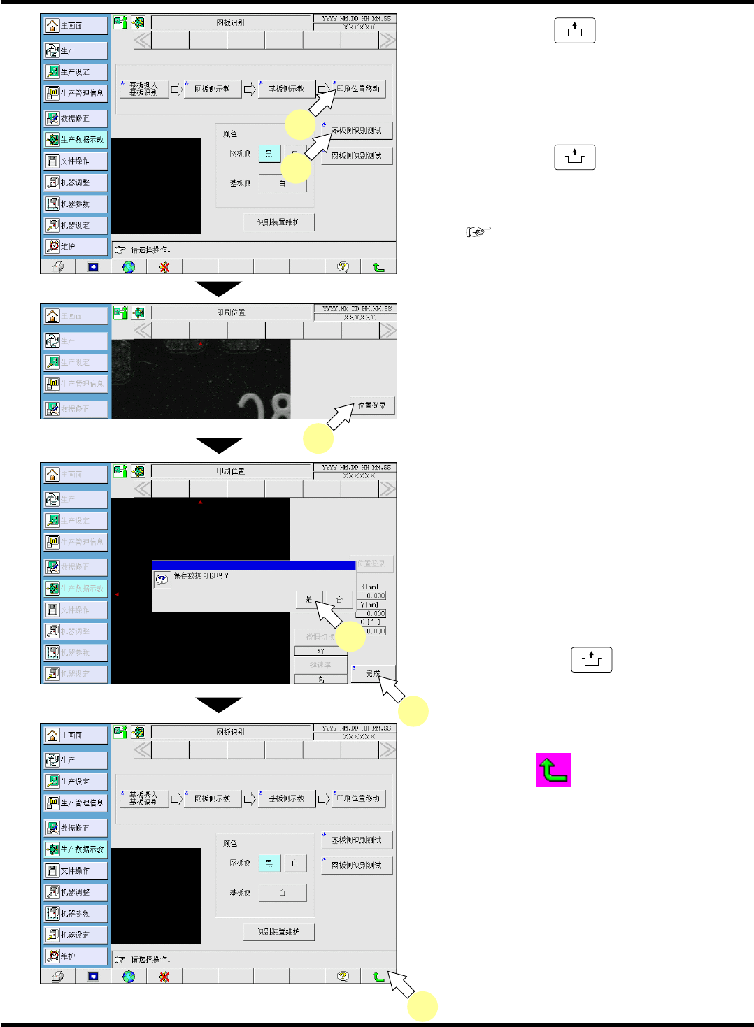 SP18P-L 操作手册 4.3 网板识别示教 Pa ge 4- 18 7. 按 [ 完成 ] 。 • 自动保存数据。 8. 按操作面板的 UNLOCK + [ 次识别位置 ] 。 • 移动到下一个识别点。 9. 反复进行步骤 5. ~ 8. 的操作。 • 识别示教结束后,返回 到 < 网板识别 > 画面。 10. 按操作面板的 UNLOCK + [ 网板侧识别测 试 ] 。 ∗ 能确认识别点是否正常 或识别动作是否正常进 …