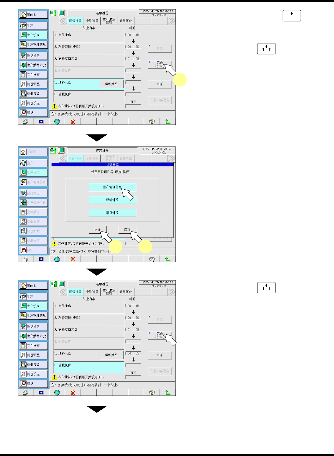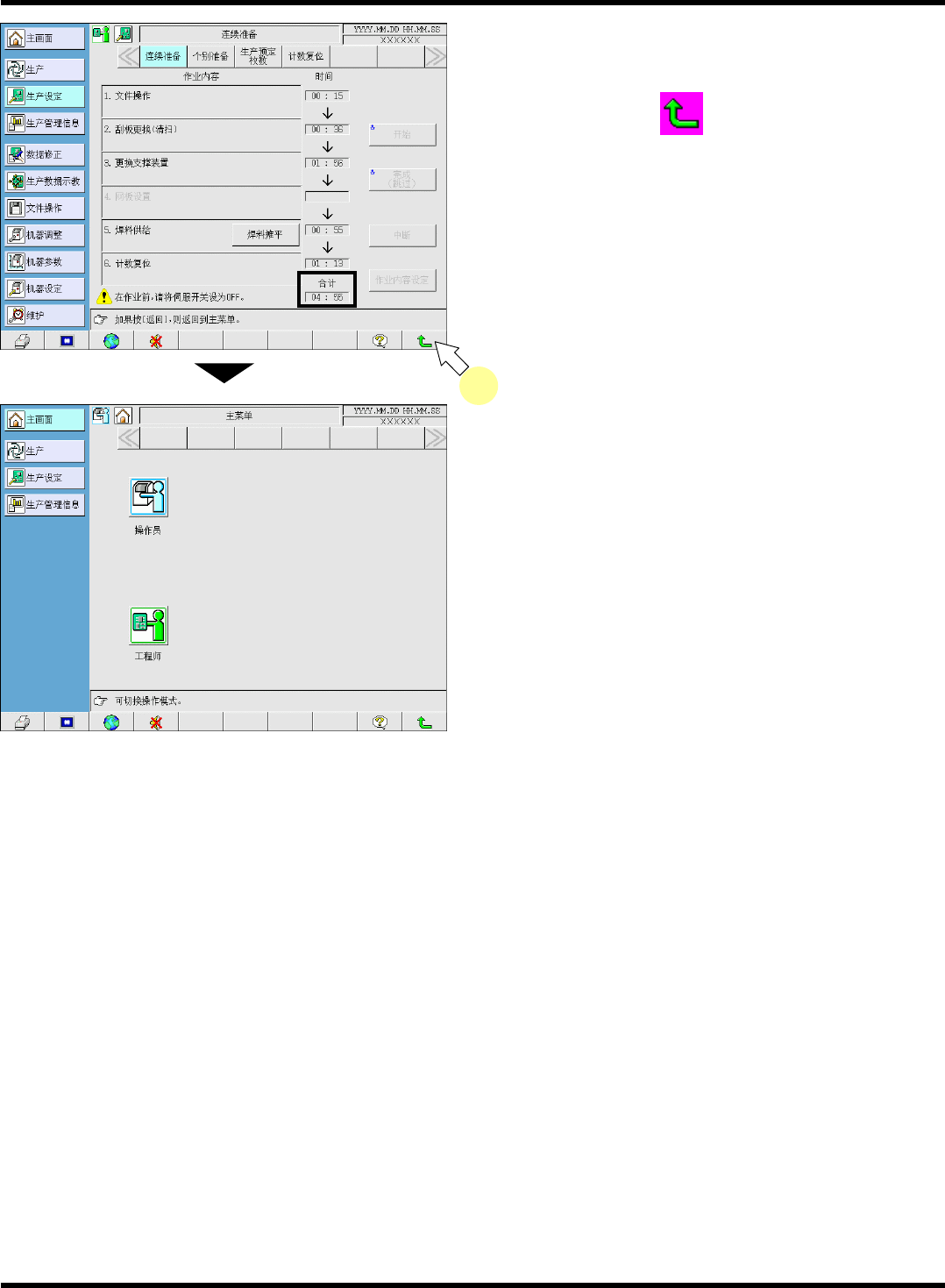 SP18P-L 操作手册 5.9 程序转换 ( 连续程序模式 ) Pa ge 5- 22 11. 所有的作业都完成后,作业共计时间将被 显示。 ∗ 如果按功能键的 ,将返回 < 主画面 > 。 EJP1A- C-OMA05-A02- 01 EJP1A-Ho -0001 EJP1A-P c-0027 11