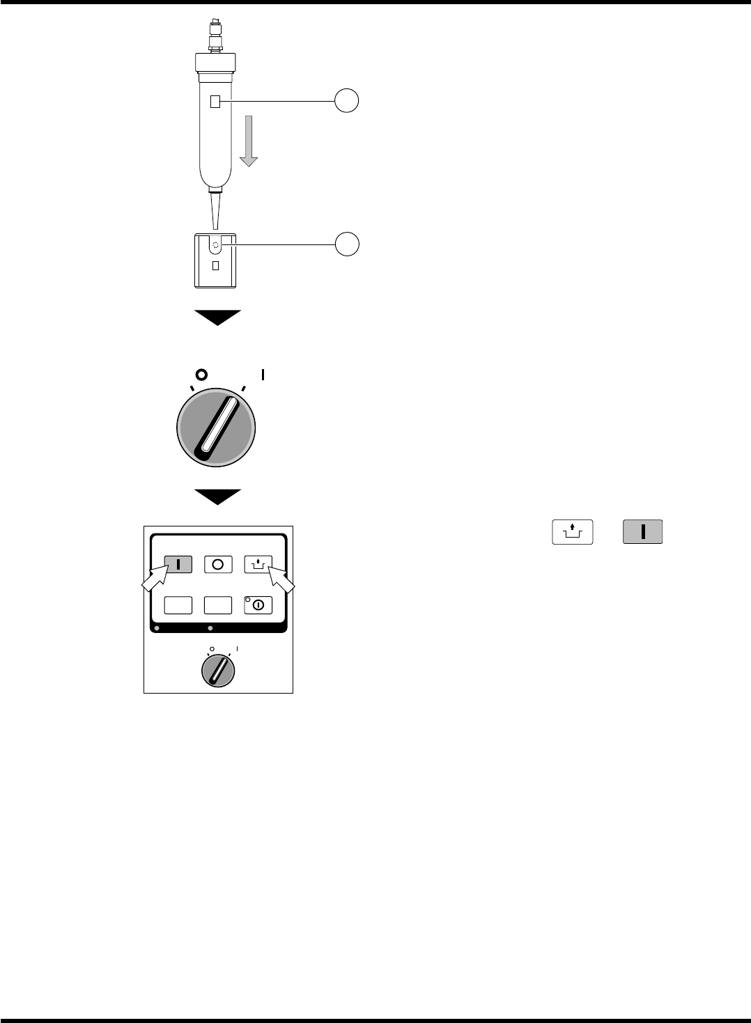 SP18P-L 操作手册 3.4 焊料的供给 Page 3 -15 8. 将注射器插入到支座。 ∗ 将注射器的突起部  对准支座的槽  。 9. 关闭前面的安全盖。 10. 将伺服开关置于 ON ( I ) 。 11. 按操作面板的 UNLOCK + ST ART 。 • 再次开始生产。 O FF ( ) ON ( ) S E RVO EJP1A- C-OMA03-A02- 04 1D3C-024E 1 2 OFF ( ) ON (…