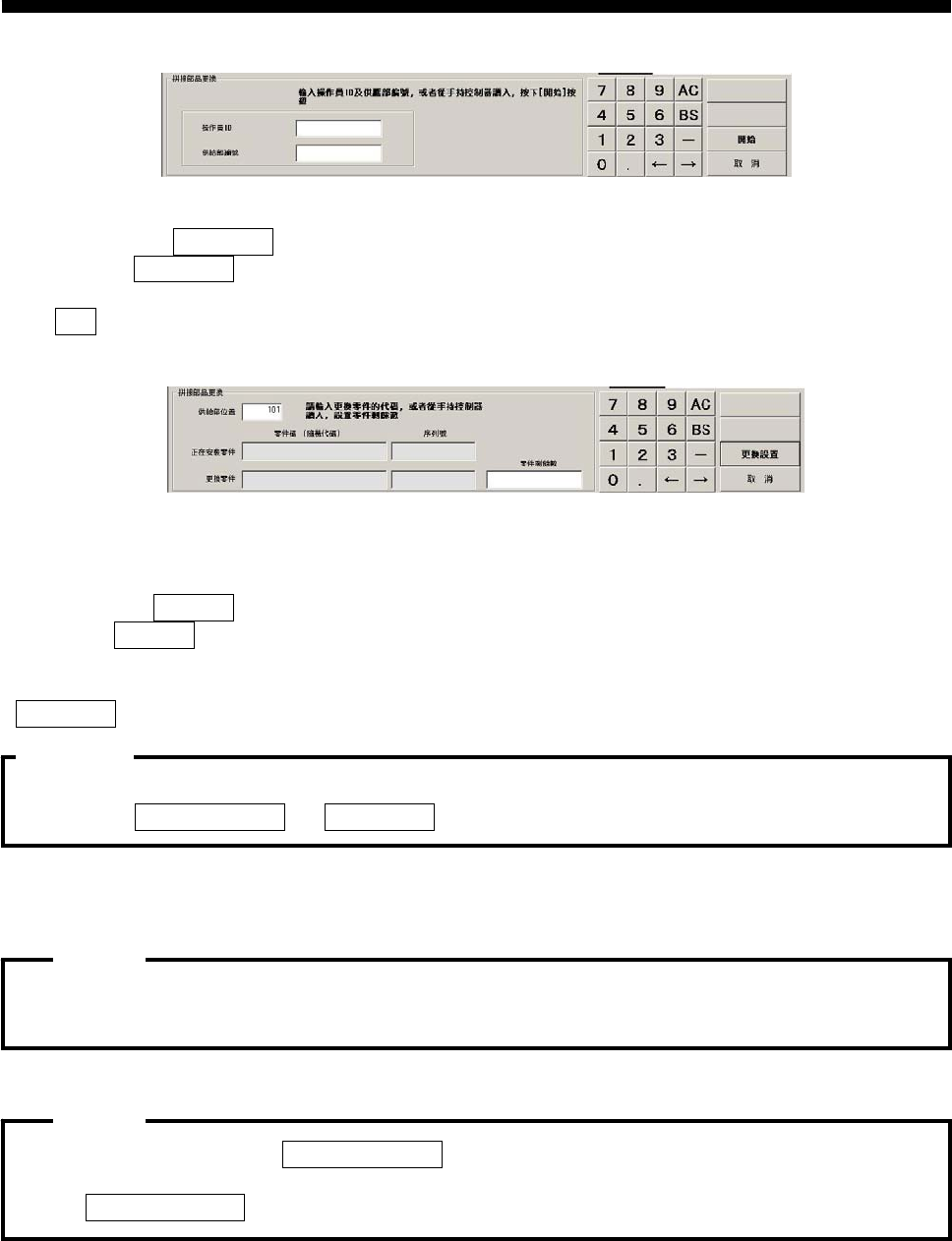 操作篇 电子零件贴装机 SI-G 200MK5 系列 1-70 (4) 零件交换条形码为TypeC(形式C)时 图 2.5.4-9 连接料带零件交换 使用条码读取器读 取操作者 ID 。 实施交换时将 供给部号码 以键盘直接输入或是以条码读取器来读取。 按下 开始 键后出现以下画面。 图 2.5.4-10 连接料带零件交换 现贴装中零件的 零件号码 以条码读取器来读取。 现贴装中零件的 机器序号 以条码读取器来读取。 交换零件的 零件号…