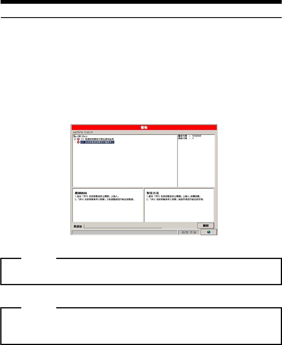 警报发生时, 显示出警报内容的对话框, 此对话框在画面上表示出详细警报的内容及处理方法。