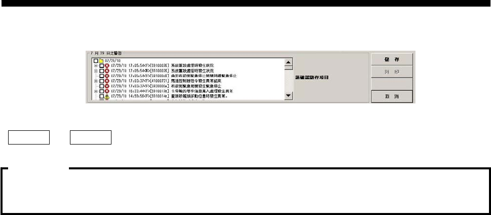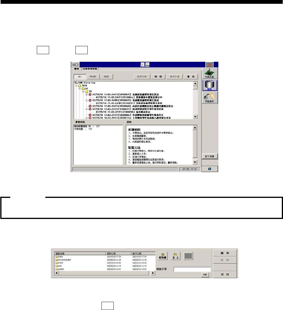 因表示出机种文件选择对话框,请选择 储存 键。以文本形式的文件储存选择的警报资料( 含详细警报)。