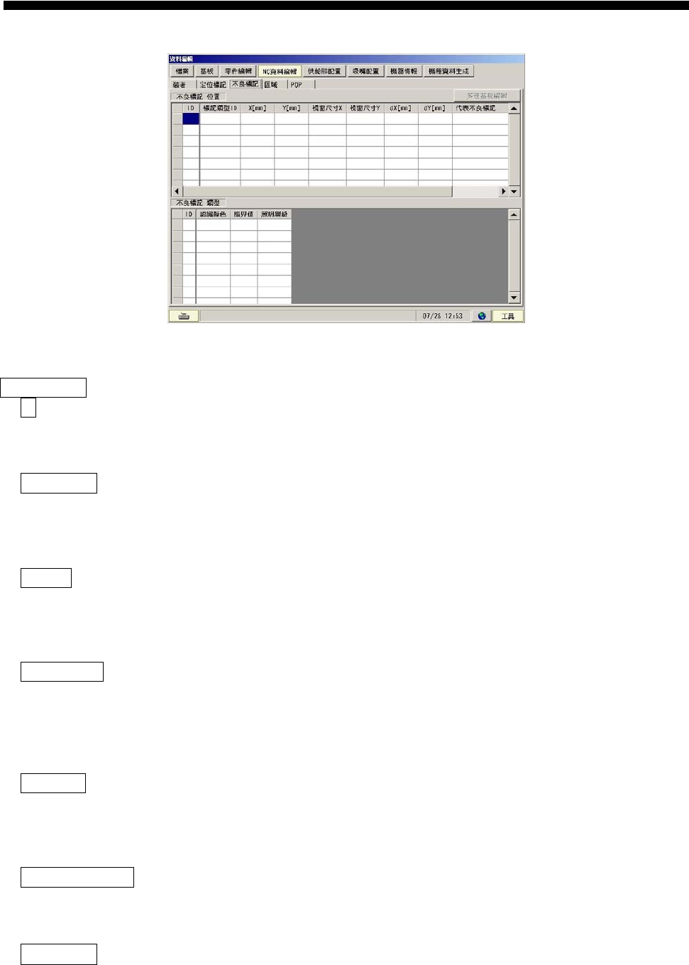 操作篇 电 子零件 贴装 机 SI-G200MK5 系列 1-138 1.1.4.3 不良标记 图 1.1.4-3 数据编辑-NC 数据编辑-不良标记画面 不良标记位置 : ID : 表示所登录数量的序列编号。通常请 不要编辑。 设定范围:1~500 标记类型 ID : 输入使用的不良标记形式的 ID 。 设定范围:1~20 X/Y[mm] : 输入设定不良标记位置的 XY 坐标。 单位:mm 设定范围:-999.999 ~999.99…