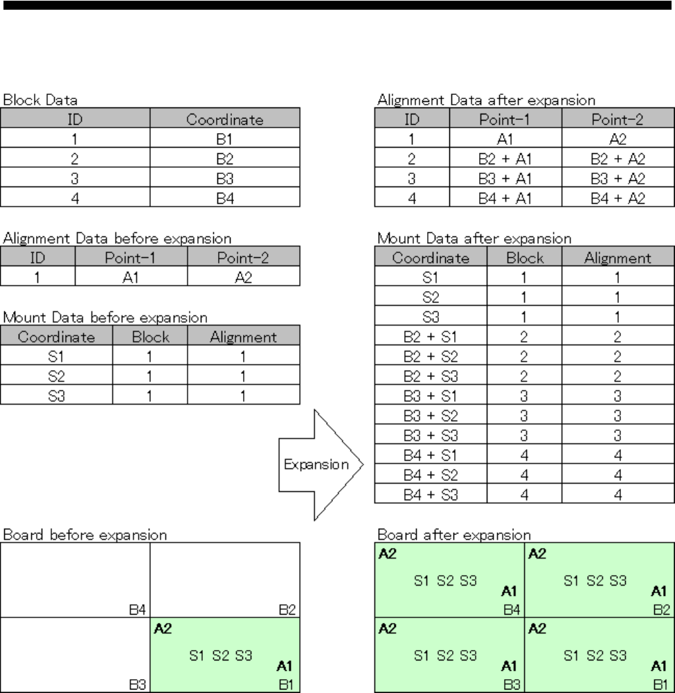 操作篇 电 子零件 贴装 机 SI-G200MK5 系列 1-144 [不良标记的展开例] 给步骤设定了不良标记时, 和零件一样不良标记也能展 开。 以下是零件和不良标记的展开例。 不进行展开而使用 现有的位置时向 不良標 記 ID (不良标记 ID)输入"0"。