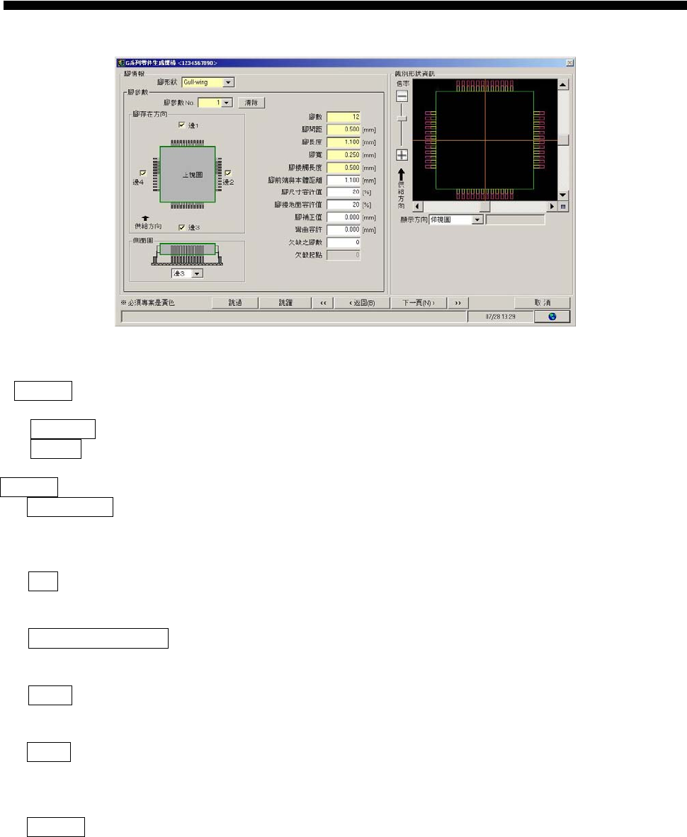 操作篇 电 子零件 贴装 机 SI-G200MK5 系列 1-160 焊脚长 : 输入焊脚长。 单位:mm 设定范围:0.001~99.999 焊脚宽 : 输入焊脚宽。 单位:mm 设定范围:0.001~99.999 接触面的长度 : 输入焊脚和基板接触面的长度。 单位:mm 设定范围:0.001~99.999 焊脚前端与本体距离 : 输入焊脚前端与本体的距离 单位:mm 设定范围:-999.999 ~999.999 焊脚尺寸容许值 :…