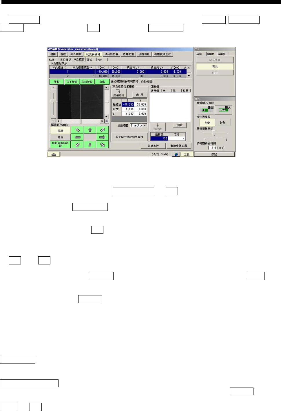 在 NC 数据编辑 输入包括不良标记数据的机种数据后,能执行不良标记教示。 数据编辑-NC 数据编辑 画面的