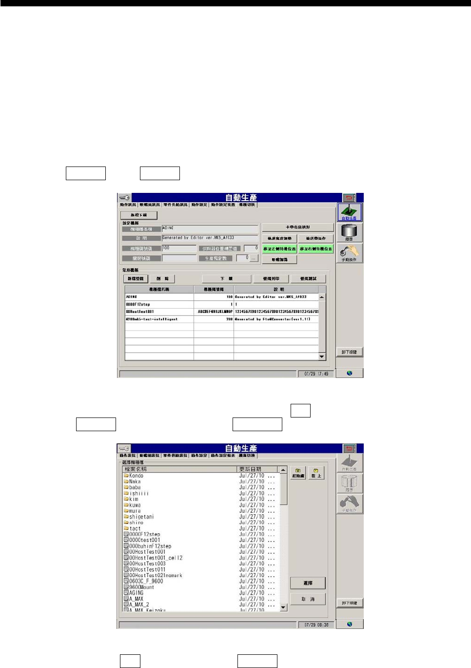 指定生产机种文件, 点击选择键。对话框消失,选择机种切换画面的设定机种框,显示机种文件。
