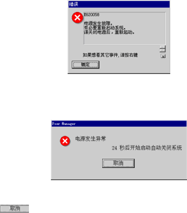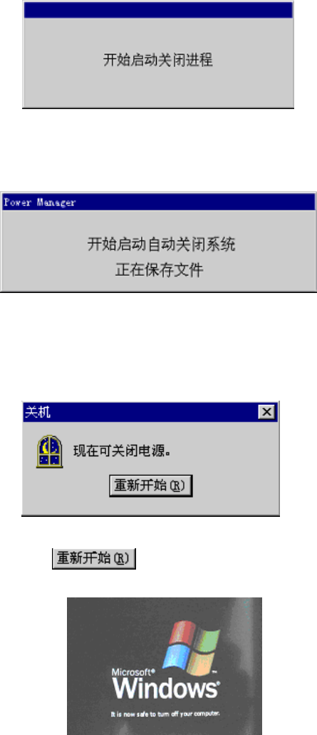 第 4 章 桌面 4-44 图 4.3-3 开始关闭 步骤 2 .保存文件 开始自动关闭时,把继续工作时所需的信息保存到暂时文件里后,然后退出应用程序。 图 4.3-4 文件保存 步骤 3 .关闭处理 (1) 关闭电源的准备工作 退出应用程序后,关闭 Windows NT/XP ,进入可以关闭电源状态时,显示下列画面。 图 4.3-5 关闭完成 (注) 这时请不要按下 按钮重新启动。一定要在此状态下关闭电源。 图 4.3-6 Windo…