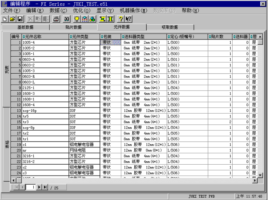 第 5 章 编辑程序 5-38 5.4 元件数据 5.4.1 基本操作方法 元件数据的输入画面,有表格显示和列表显示两种形式。表格画面、或和列表画面,通过 点击标签切换。从其它画面单击元件数据标签时,首先显示列表。 5.4.1.1 列表显示画面 列表显示画面,以列表形式显示多个元件数据概要。 在列表画面上不能输入数据, 只可查看数据的完成情况。 此外, 可移动高亮光标, 按[ Enter] 键,或双击鼠标左键,切换到所选择的元件表格画面…