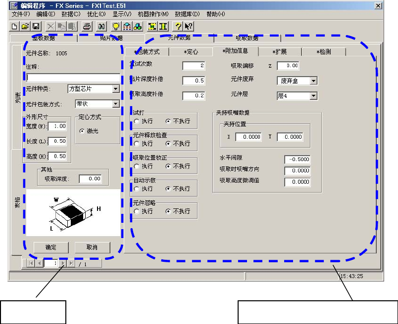 表格显示由基本部分和包装方式、定心、附加信息、扩展、检测等各部分(对话框)构成。