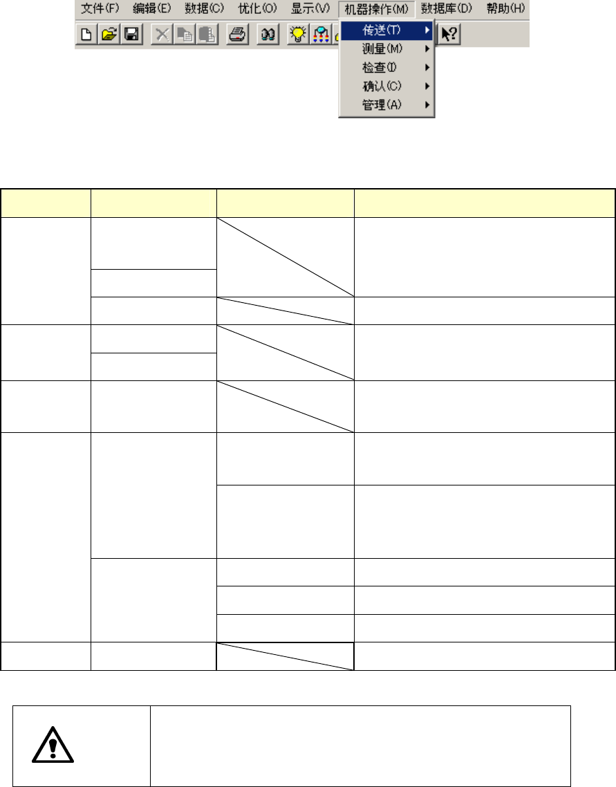 第 6 章 编辑辅助功能 6-62 6.5 机器操作 主机运行后可进行各种实际操作。每项操作各有独自的菜单项目。 图 6.5-1 机器操作 菜单和辅助菜单的概要 菜单上的机器操作项目及其子菜单功能简介。 菜单项目 子菜单 1 子菜单 2 概要 基板搬入 基板搬出 将基板输入主机或从主机输出基板。 传送 自动调整基板宽度 调整基板宽度 单独 测量 连续 测量各元件数据的详细值。 检查 速度确认 进行模拟生产,确认运行中的 XYθ的 偏差量…