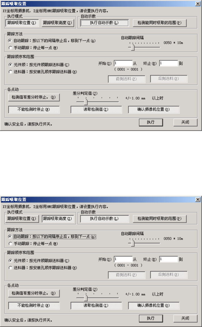 第 6 章 编辑辅助功能 6-111 1)执行模式 (1)跟踪吸取位置 用照相机跟踪吸取位置。 (2)吸取高度跟踪 吸取高度跟踪。 * 两个按钮都按下时,摄像机跟踪吸取位置后,进行吸取高度跟踪。 2)自动示教 (1)执行自动示教 进行自动示教。 自动示教对象限于 0603~3216 尺寸的、 包在 8mm 纸带的方形芯片元件。 以下情况下不 作为对象。  非方形芯片  包装方式非 8mm 纸带 (2)检查能同时吸取的范围 在优化后的…
