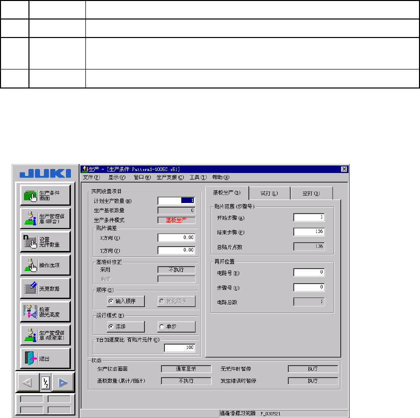 第 8 章 生产 8-3 8. 1. 1 生产模式 生产有基板生产、试打、空打三种运行模式。 No. 生产模式 内容 1 基板生产 设定生产数量,实际生产基板。 2 试打 在实际进行生产前,限定元件进行试打,使用贴片摄像机的跟踪功能, 判断贴片正确与否。如有不合格品,通过示教进行调整。 3 空打 不使用元件而确认吸取贴片动作情况。 * 进行基板生产、试打、空打时,可设置各自的生产条件、试打条件、空打条件等。 8. 1. 2 生产主菜单 …
