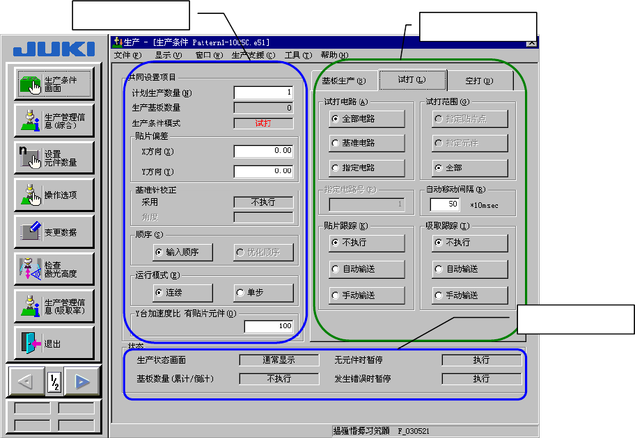 在画面左边设置共同设置项目,如计划生产数量、贴片偏差、顺序,以及运行模式等。