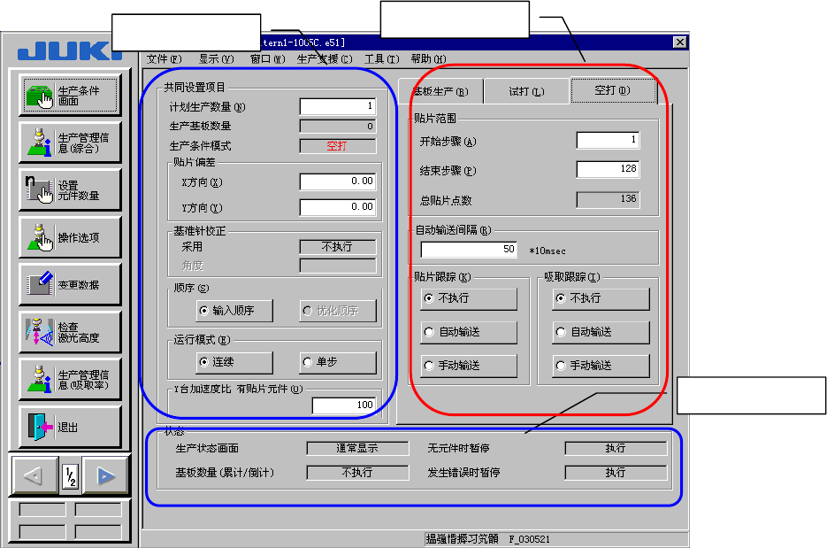 在画面左侧的共同设置项目上,设置计划生产数量、贴片偏差、顺序以及运行模式等项目。