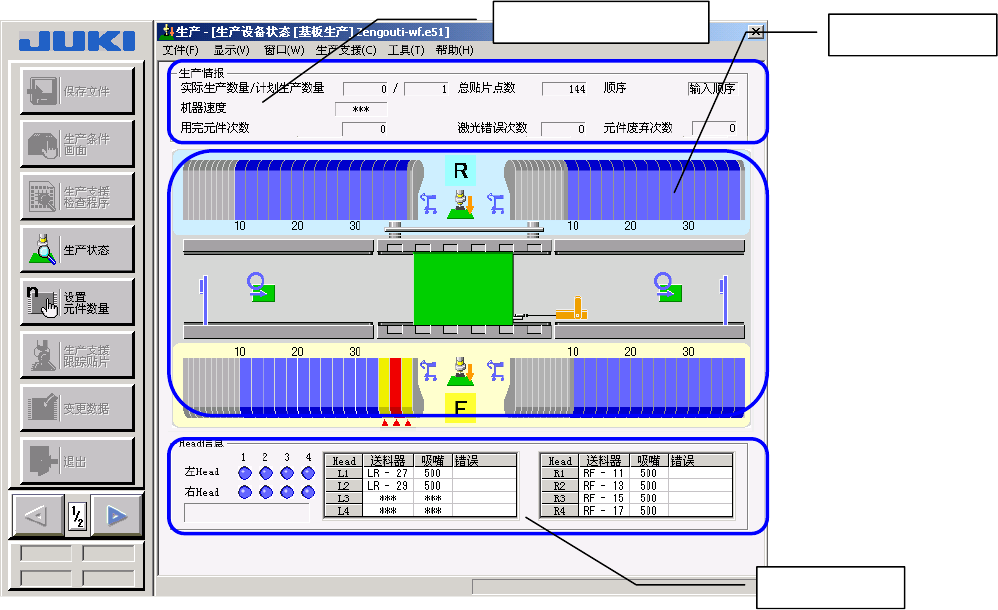 生产设备状态画面主要显示生产情报(信息)、设备状态、以及贴片头(HEAD)信息等。