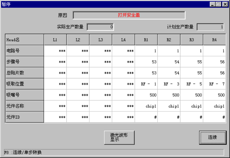 在生产过程中打开安全盖时,会显示如下对话框,机器进入暂停状态。