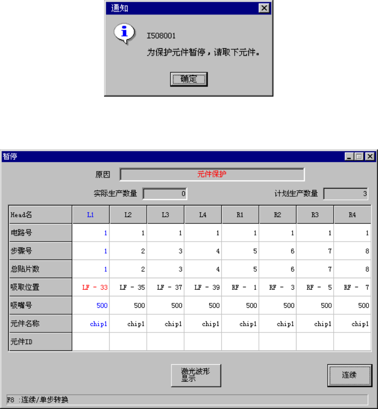 在生产操作中送料器台架下降时,会显示如下对话框,机器进入暂停状态。