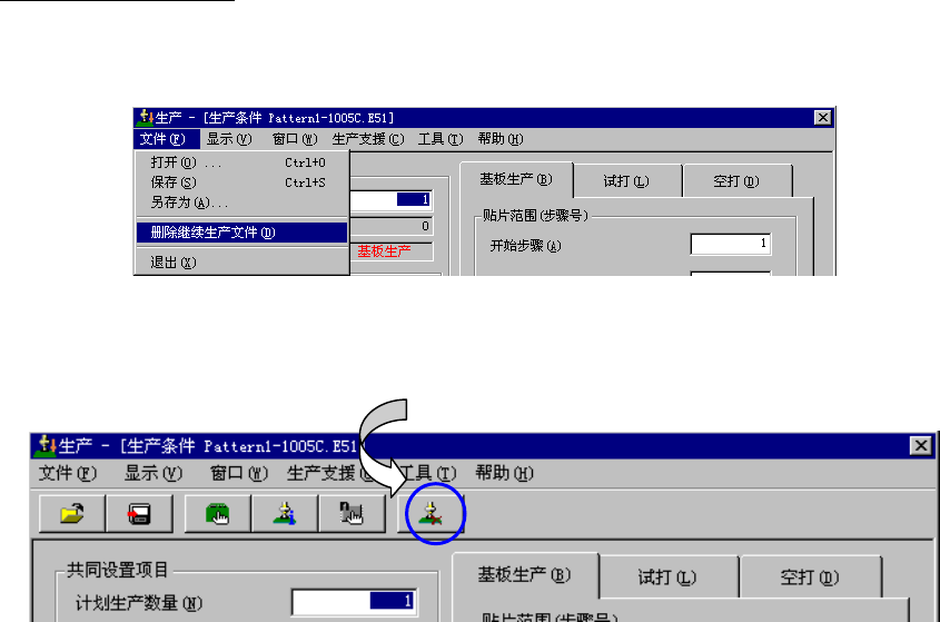 当存在继续生产数据时,[文件]菜单的[删除继续生产文件]命令按钮,及工具栏的[删除