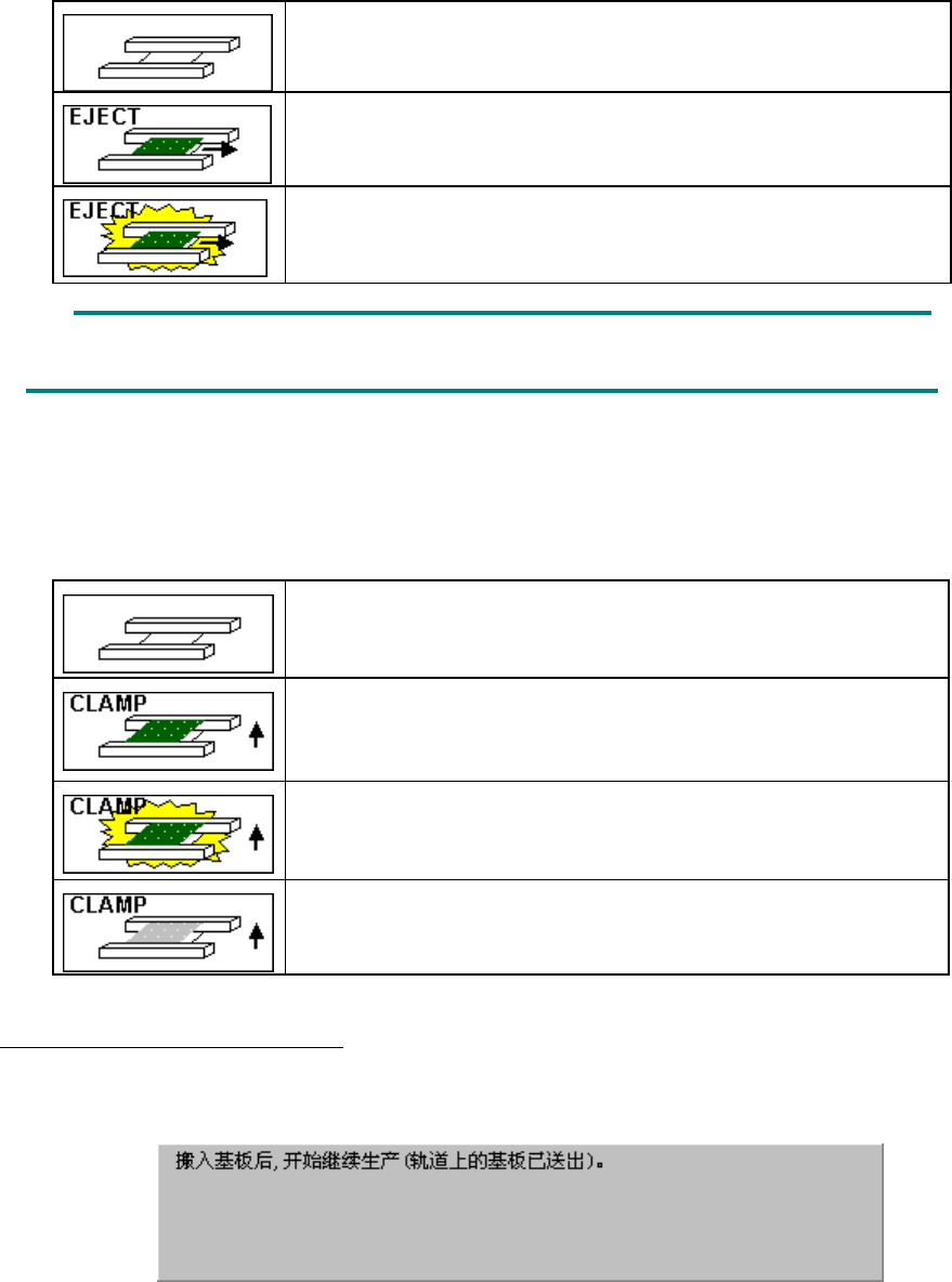 第 8 章 生产 8-90 (1) 选择[搬入基板后生产] 时: 显示停止传感器判断的传送轨道上的状态。 传送轨道上无基板。 需要搬出传送轨道上的基板。 中断生产时传送轨道有基板, 因已全部完成元件贴片, 需要搬出基板。 搬出传送轨道上的基板。 但是可能有次品、误贴片,基板搬出时需要注意。 单击显示的图像,可将站台上的基板放置在适于重夹的位置。 (2) 选择[运行重夹后生产] 时: 显示停止传感器判断的传送轨道的状态,或已知上次生产中断…