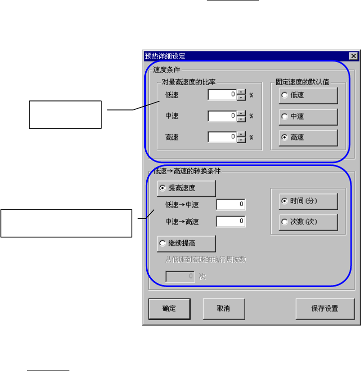 从速度设定中选择[低速→高速]、按下[详细设定]按钮后,显示下列[预热详细设定]