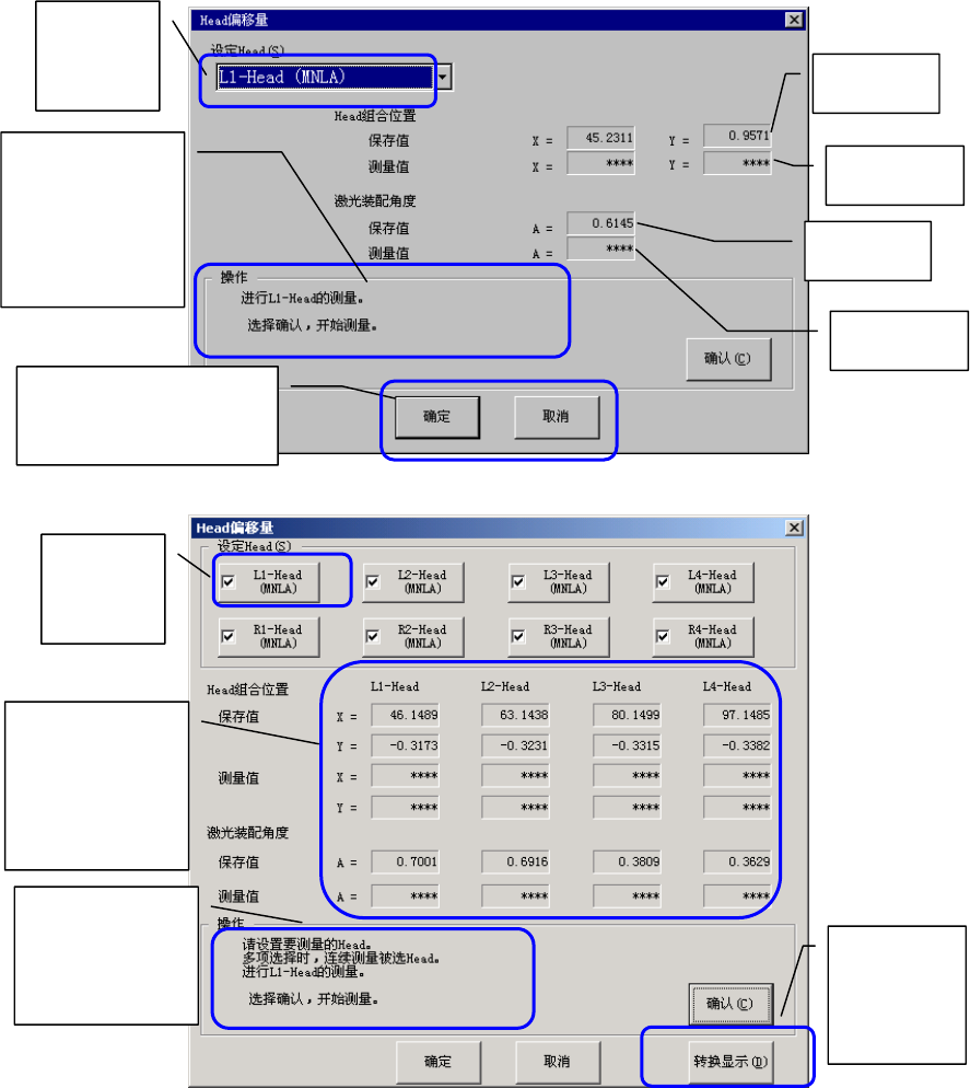 在此对话框中进行组装位置及激光校正的组装角度的测量。