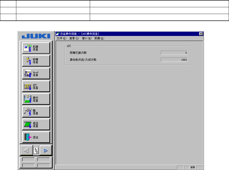 第 14 章 设备操作信息 14-20 14.1.11. ATC 操作信息 在菜单栏中选择[窗口]→[其它]→[ATC 操作信息]后,显示[ATC 操作信息]画面。 表 14.1-11 ATC 操作信息的显示内容 No 项目 内容 1 吸嘴交换次数 各汽缸交换吸嘴的累计次数。 2 滑动板开启/关闭次数 滑动板开启关闭的累计次数。 图 14.1-25 ATC 操作信息