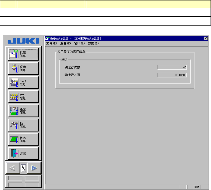 第 14 章 设备操作信息 14-23 14.1.14. 应用程序运行信息 在菜单栏中选择[窗口]→[其它]→[应用程序运行信息]后,显示应用程序运行信息。 表 14.1-14 应用程序运行信息 No 项目 内容 1 轴运行次数 预热时轴运行的累计次数。 2 轴运行时间 预热时轴运行的累计时间。 图 14.1-28 应用程序运行信息