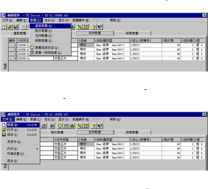 第2章 基本操作 2-13 (2) 用快捷键选择命令项目的方法 在键盘上输入下拉菜单命令项目最后的英文字母 (有下划线) , 如 [文件 ( F )]字, 便可选择和 执行该命令。 图 2.4-4 使用快捷键选择下拉菜单 上图:用 [Alt] 键激活菜单栏后,按[C] 键时的画面。按[数据(C )]后出现下拉菜单,若继续 按[P]键,即可执行[贴片数据(P )]。 如果下拉菜单右侧有组合键显示时,则无需激活菜单,而直接用快捷键执行命令。…
