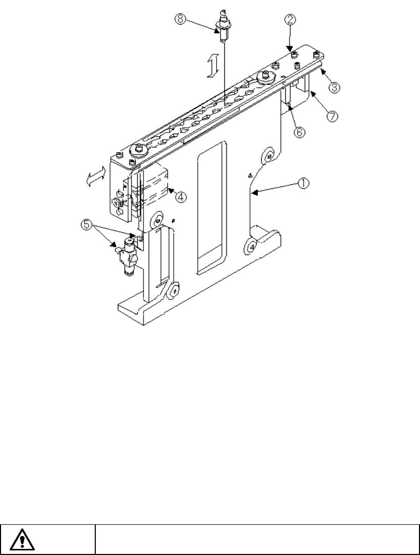 第 16 章 维护 16-19 16.3.6 ATC ①ATC 底座 ⑤速度控制器 ②滑动板 ⑥ATC OPEN 传感器 ③ATC 底座板 ⑦ATC CLOSE 传感器 ④气缸 ⑧吸嘴 图 16.3-9 ATC(FX1) 在「滑动板②」的上面若附着有芯片和脏东西,可能影响 吸嘴的正常安装、拆卸,所以请使用含 有酒精的棉纱进行清洁。 危险 为了防止意外启动造成的事故,请在关掉电源后进行清洁工作。