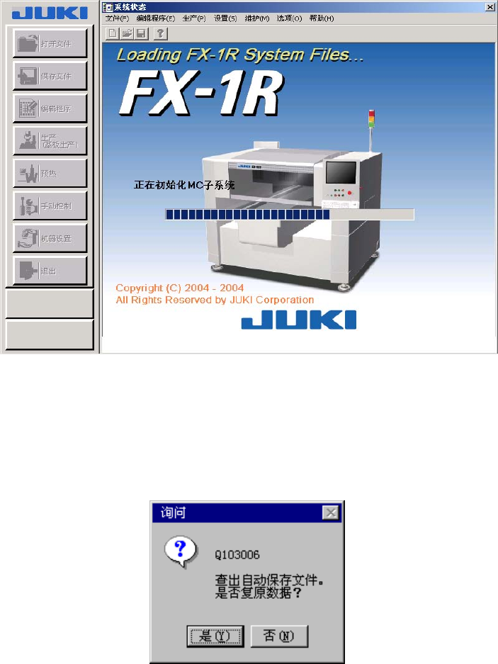 第 4 章 桌面 4-1 4. 桌面 4.1. 系统的启动和退出 4.1.1. 启动 打开电源后,FX-1 启动 Windows NT 系统,FX-1R 启动 Windows XP 系统。接着,启动主机系 统软件,进入系统的初始化。 图 4.1-1 初始化中的画面 若是上次系统运行时因生产中系统异常而结束生产时,会有下图询问显示。对此,可从自动保 存的生产程序中恢复异常结束时的生产程序。 每块基板生产完毕后,自动保存生产程序。 自动保存…