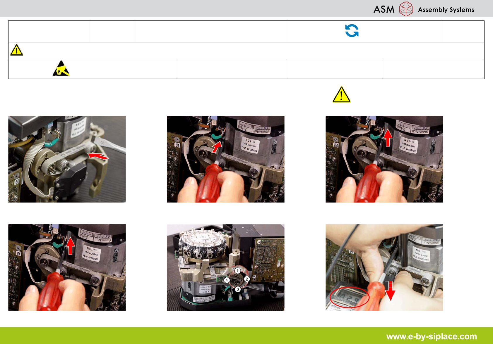 E-by SIPLACE CP12 & CP6 调整 Z 轴皮带的张力 部件更换 2/3 注意 使用贴片机前,请参阅用户手 册中的安全须知。 遵守防静电守则 工具: 易损件: 耗材: 7. 分别将几个螺钉拧松 (必要时)以降低 Z 轴电机的皮带张力。 8. 再次检查皮带张力 并在必要时调整 (280H Z +/-10)。 9. 检查四 颗 M3 x5 六角套 筒螺钉是否已固定妥 当。 10. 将两颗 M3x14 六角套筒螺钉拧紧…