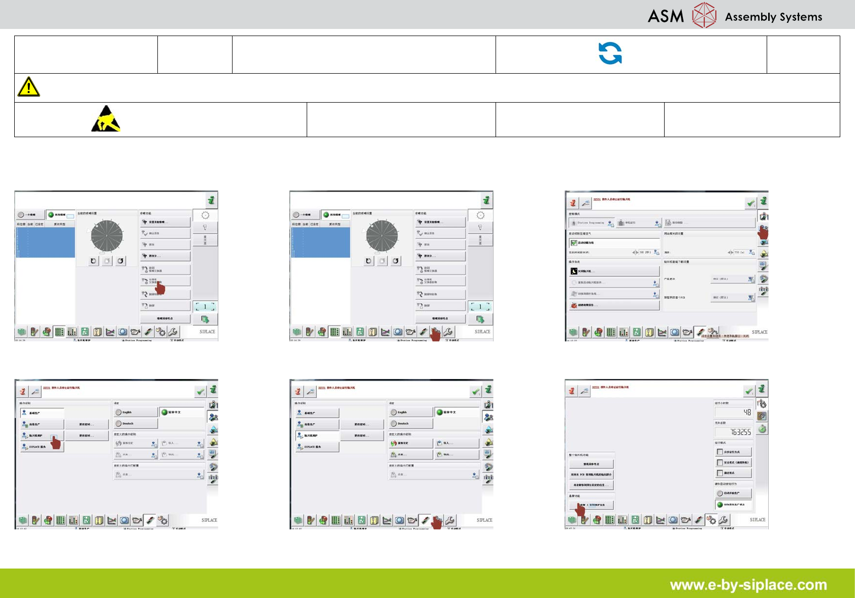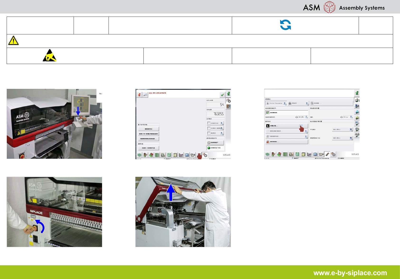 E-by SIPLACE CP12 & CP6 返回吸嘴并关闭贴片机 部件更换 3/3 注意 使用贴片机前,请参阅用户手 册中的安全须知。 遵守防静电守则 工具 易损件: 耗材: 13. 按下启动。 14. 单击 “ 设置选项传送导轨接口与关闭 ” 图 标。 15. 单击 “ 关闭贴片机 ” 图标。 16. 关闭贴片机。 17. 移动前将 盖打开并检查是否有阻塞。