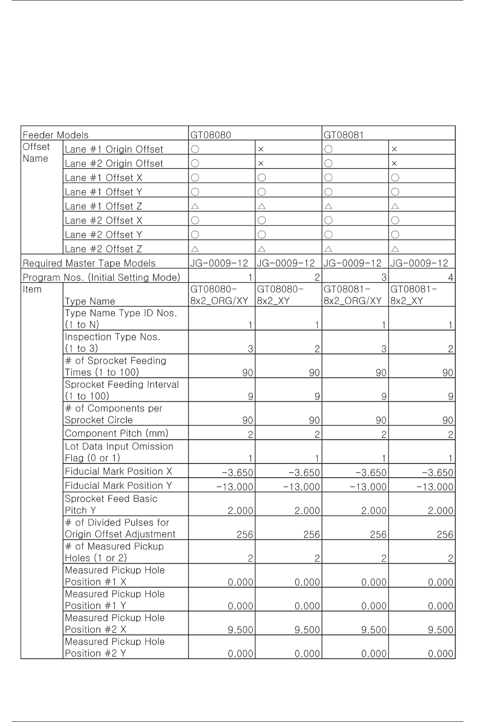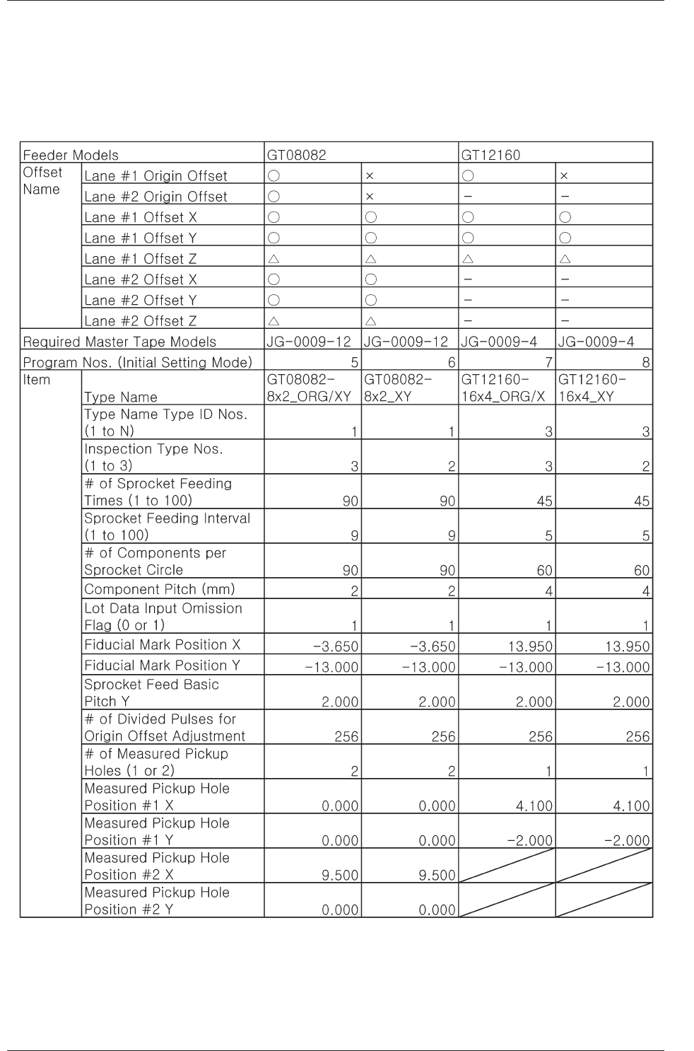 4-27 4. 送料器测量用程序的初期设定值 ○ : 可用送料器调整治具测量。 △ : 可以将用高度规测量的数据输入到送料器调整治具里。 × : 不能测量。 TableD7 051 1-001 4.送料器测量用程序的初期设定值