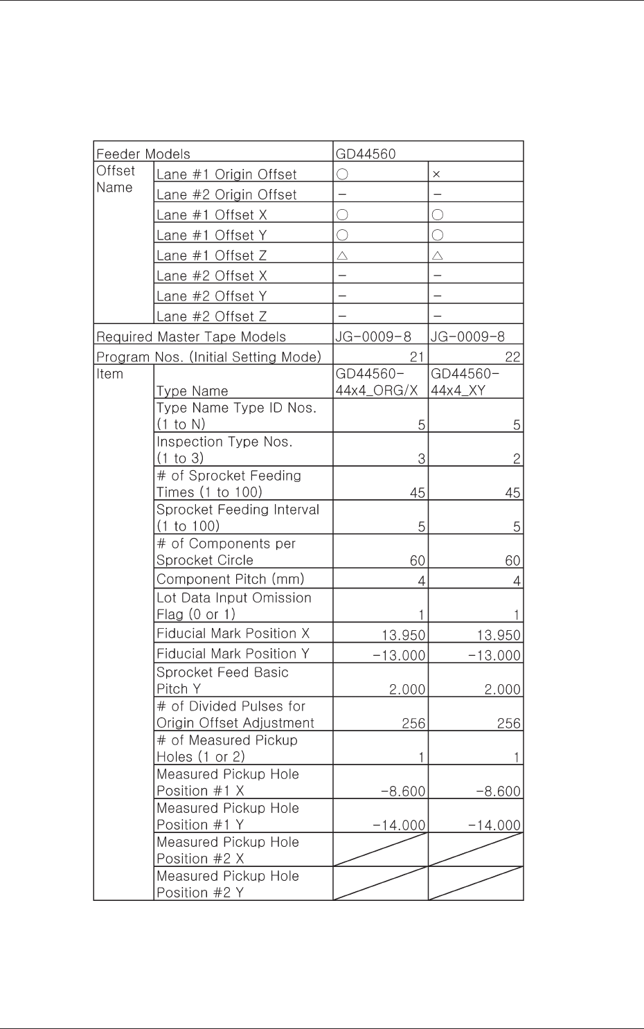 4-31 ○ : 可用送料器调整治具测量。 △ : 可以将用高度规测量的数据输入到送料器调整治具里。 × : 不能测量。 TableD11 4.送料器测量用程序的初期设定值 051 1-001
