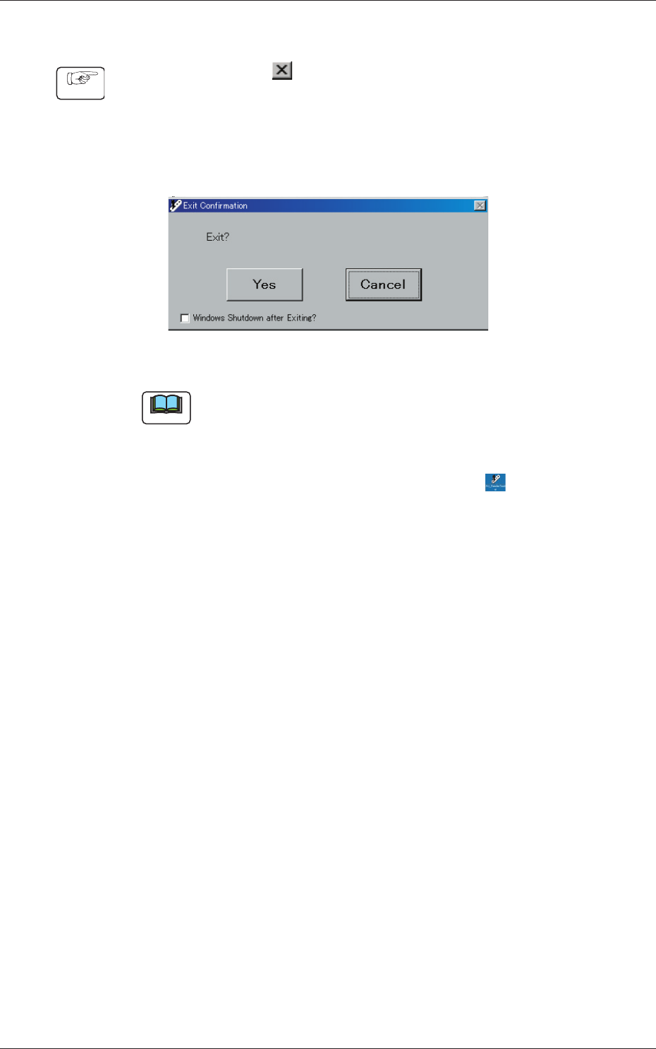 2 - 9 051 1 - 001 2.2 程序的结束 Procedure (1) 按各界面右上角的 按钮。 (2) 显示“Exit Confirmation( 结束确认 )”界面, 因此按 [Yes( 是 )] 按钮或 [Cancel( 取消 )] 按钮中任意一个。 按 [Yes] 按钮,本程序便结束。 按 [Cancel] 按钮,返回到原来的界面。 Fig.B10 Note Windows 关机功能有效 ( 默认值 ) 时,Wind…