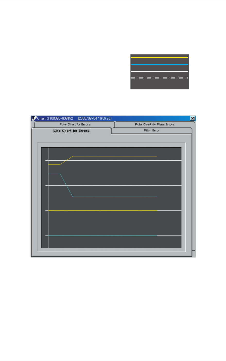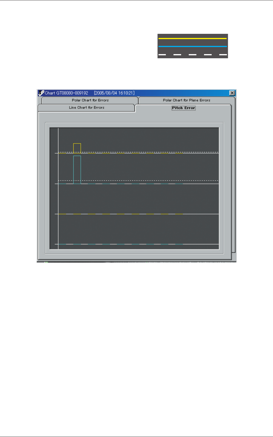 3 - 22 6.2 Chart( 图表 ) 共有四种图表,可以通过图表显示界面上部的 Tab 分别进行切换。 6.2.1 Line Chart for Errors( 误差曲线图 ) 用曲线图显示每个孔的检查结果。 黄线 : X 值 浅蓝线 : Y 值 白色实线 : 中央值 白 色一 点 一 短 横 的单 虚 线 : 0 值 从上开始按通道 1 的 X、通道 1 的 Y、通道 2 的 X、通道 2 的 Y 顺 序显示。 Fig.C22…