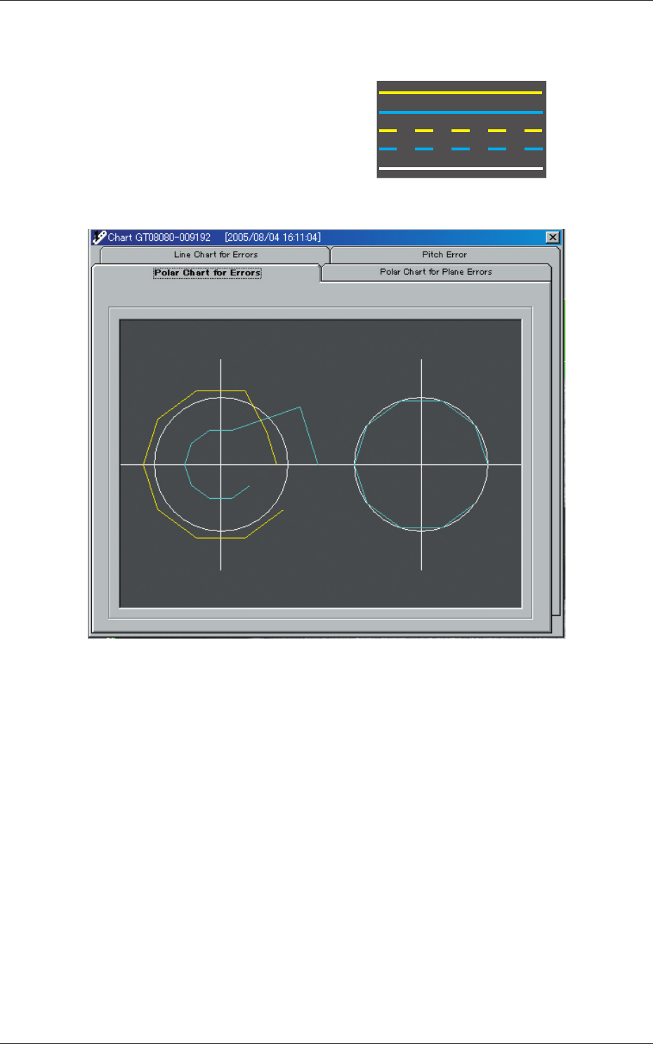 3 - 23 6.2.2 Pitch Error( 间距误差 ) 用绝对值显示各间距之间的误差。 黄线 : X 值 浅蓝线 : Y 值 白色虚线 : 绝对值的平均 从上开始按通道 1 的 X、通道 1 的 Y、通道 2 的 X、通道 2 的 Y 顺 序显示。 Fig.C23 6.2 Chart( 图表 ) 051 1 - 001