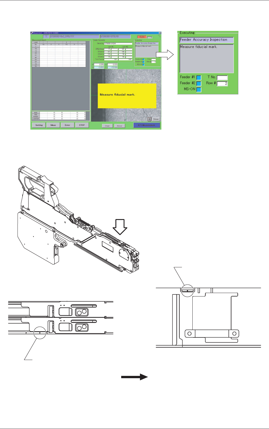 4-16 (11) 进行送料器识别标记位置的测量。 以下对话框显示三秒钟。 Fig.D18 (12) 请移动测微计,对齐识别标记位置孔和十字线中心。 4 2 4 2 Fig.D19识别标记位置 2.送料器的测量 051 1-001 G*-12160 以上的识别标记位置 ( 图解 G*-24320) G*-0808*的识别标记位置 传送方向