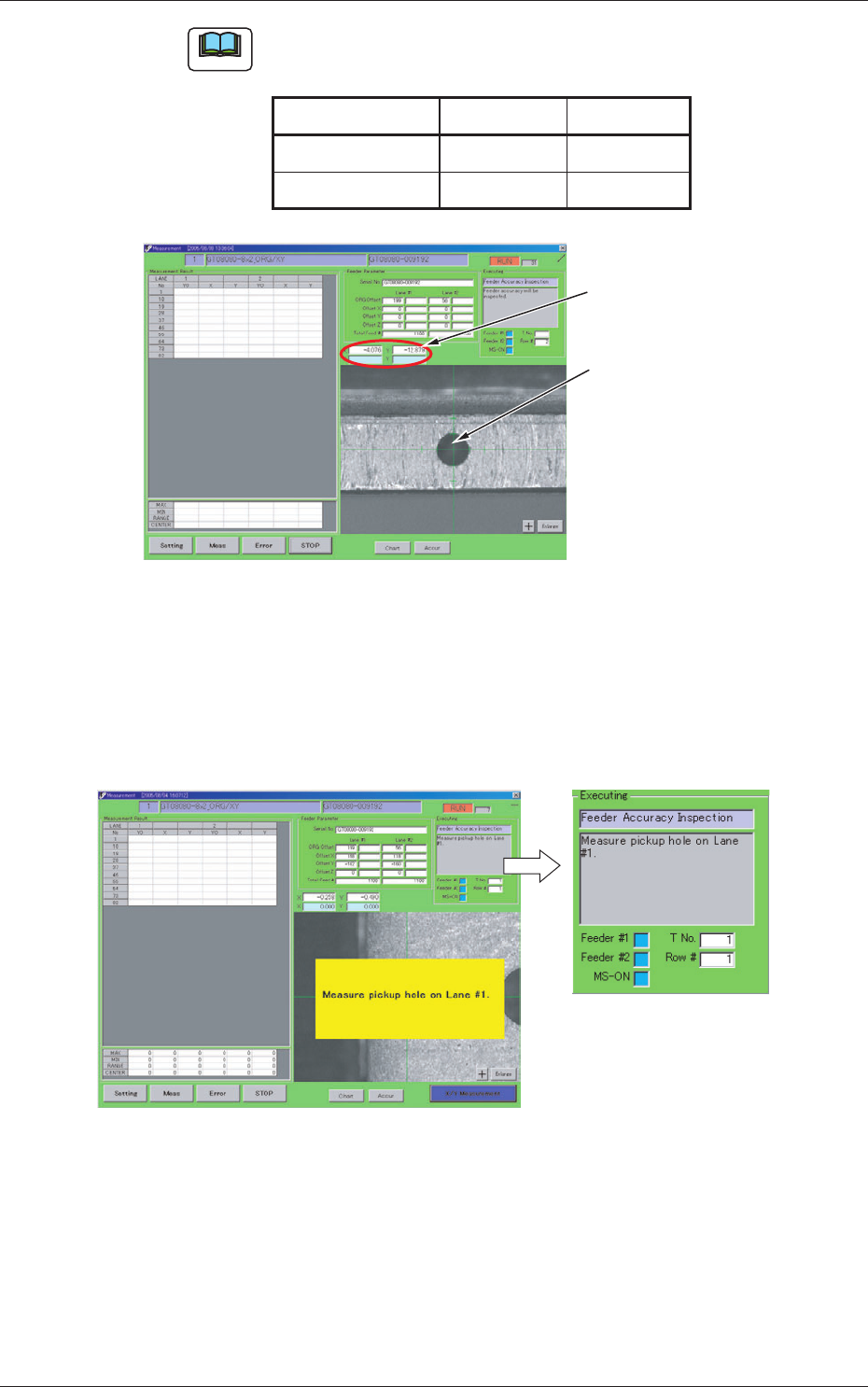 4-18 (15) 移动测微计,对齐标准料带孔和十字线中心。 在 8mm 宽送料器开始对准通道 1 的吸取位置。 Fig.D22 Note 各机种的吸取位置在个人计算机界面的 XY 位置中大概处于下表 位置。 请将光标移动到能够完全看到标准料带孔的位置进行测量。 关于 Y 方向,从下表中可以看出在 8mm 宽送料器的偏差为 0.5 mm、在 12mm 宽以上的送料器的偏差为 1mm。( 因为在测量时通 道原点补正值设为零。)…