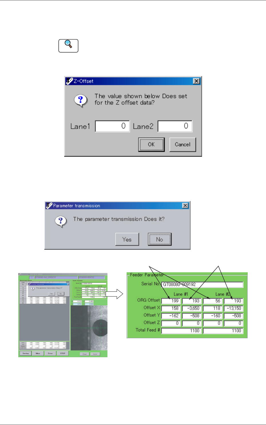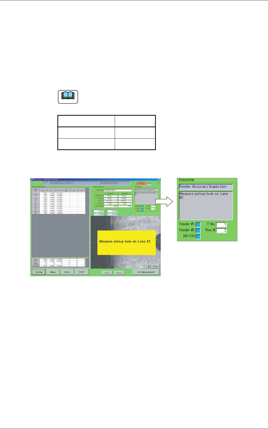 4-19 (16) 按键盘的空格键或界面的 [X/YMeasurement(XY 测量 )] 按钮,进 行吸取位置的测量。 进行该操作, 在结束测量后, 标准料带自动传送到下一个吸取位置。 (17) 标准料带传送到下一个吸取位置时,再次重新对齐标准料带孔和 十字线中心。 (18) 与 (16) 同样进行测量。 (19) 进行设定测量次数的测量。 Note 初期设定的测量次数如下。 TableD6 机 种 测量次数 G*-…