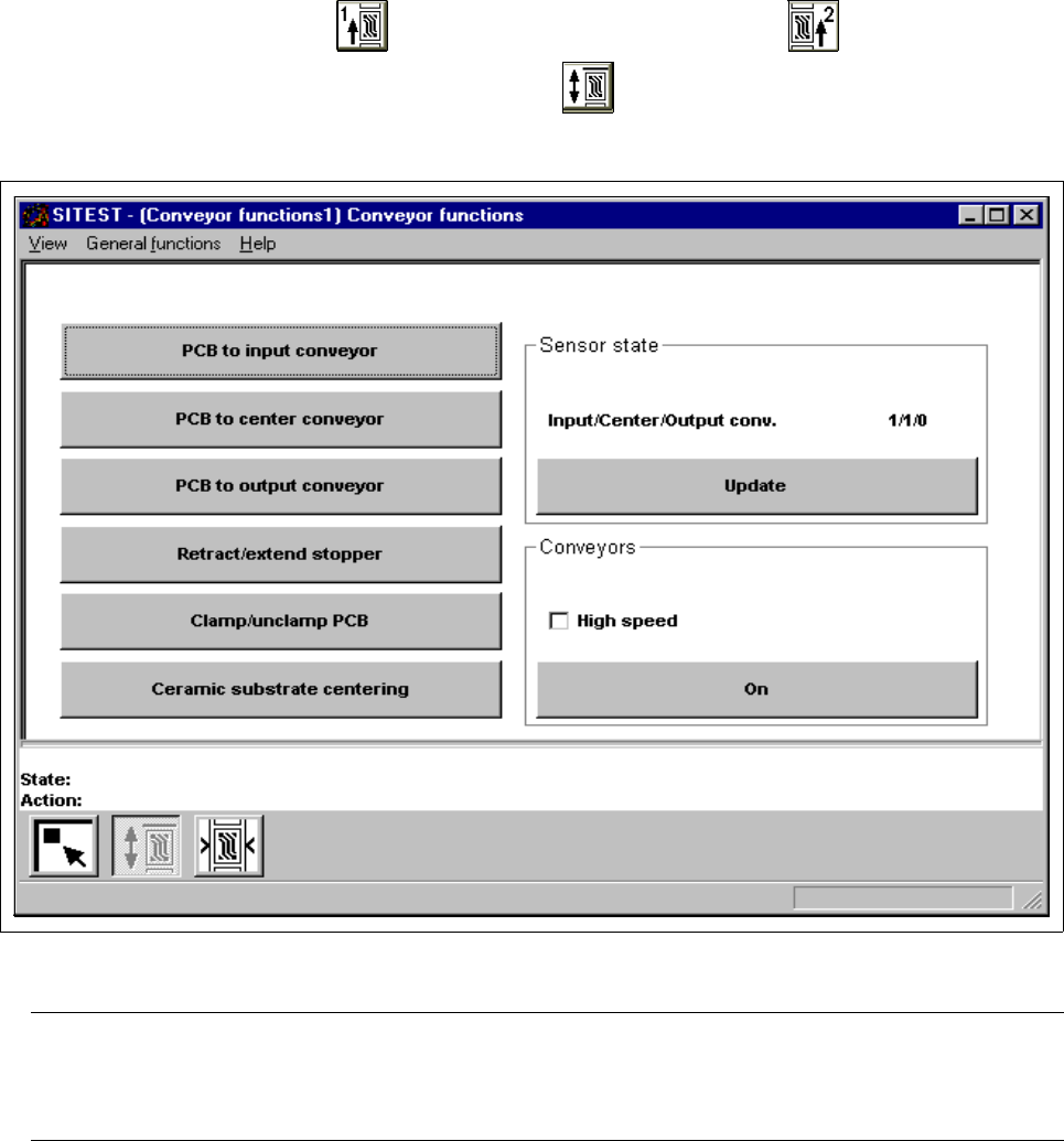 2 Functions for the Adjustment of the Machine User Manual Test Program SITEST 2.5 Conveyor Functions Software Version 405.xx Issue 01/99 2 - 28 – Updat e to dis play t he current sensor state for the input, ce nter and o…