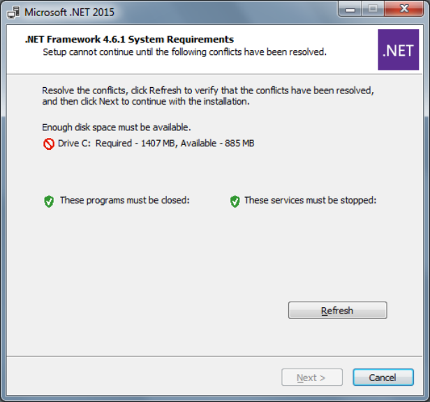 In this case, there is not enough free disk space on the "C:" drive to install .NET Framework 4.6.1.