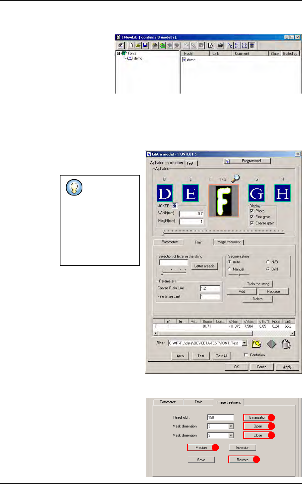 Optical Character Verification Vision 2007 4.10 User Manua l Rev 01 8 - 5 8.2.3 T rain a font in the library 1. Open the library and display the fonts 2. Create a new model (make sure you use the same name as defin ed in…