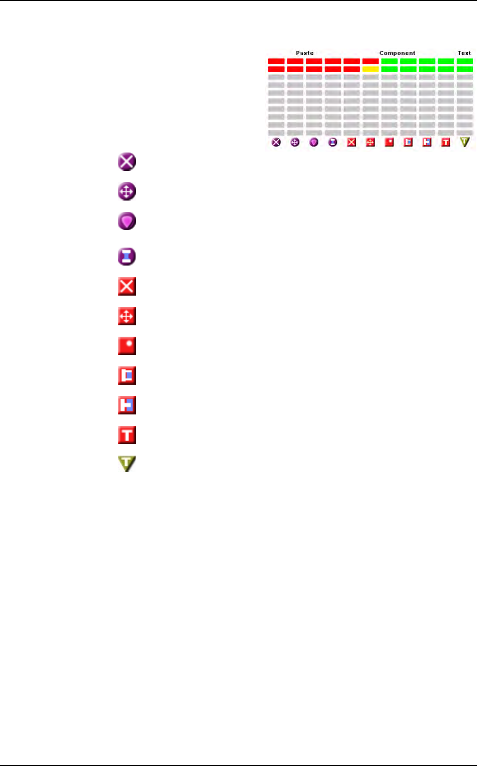 Production Vision 2007 4.10 User Manua l Rev 01 11 - 7 11.1.5.4 Table chart This table char t gives a stat us of the last 9 inspected boards. Each line represents a bo ard, and the last inspected one is in the upper po s…