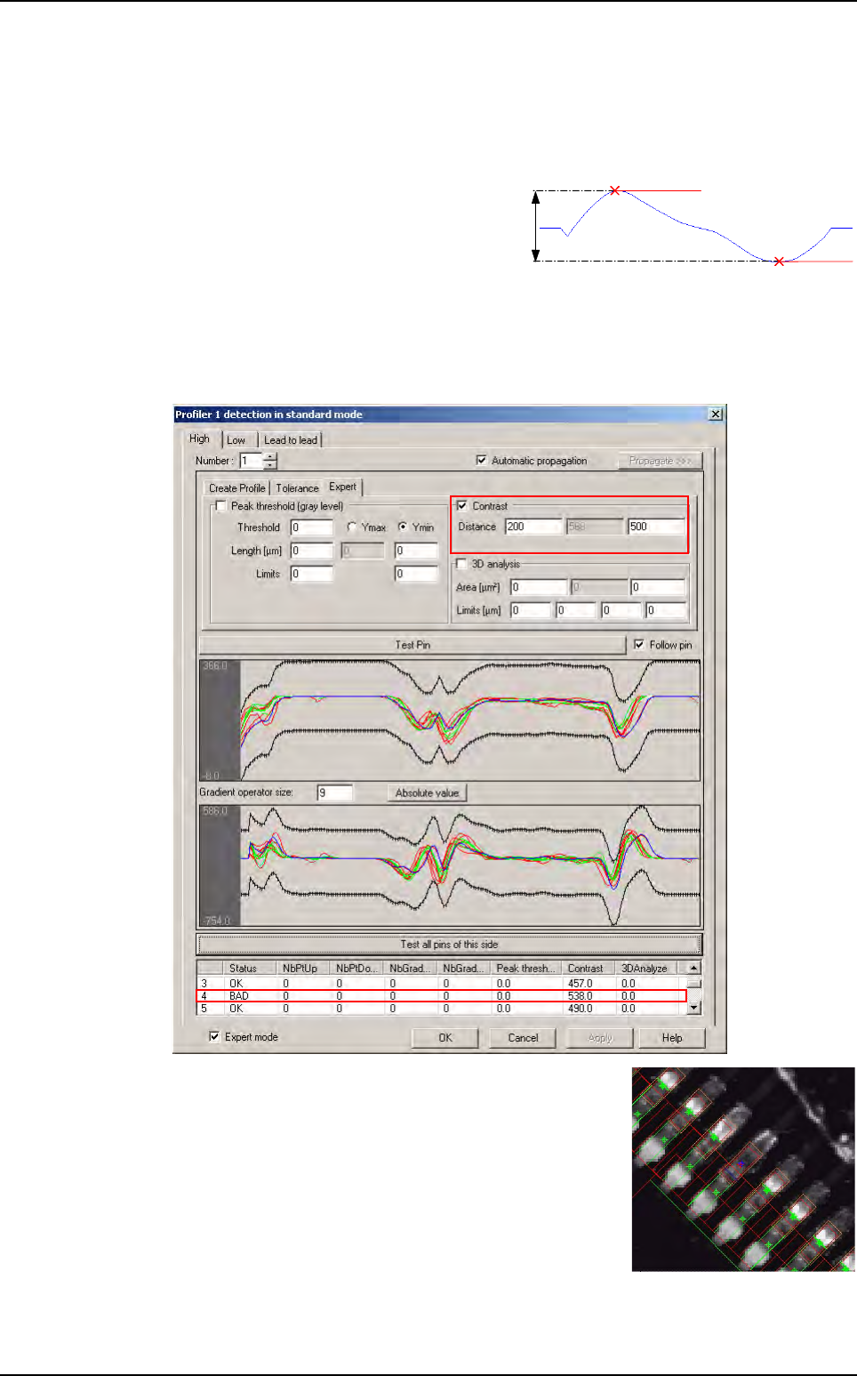 Tools library 7 - 56 Vision 2007 4.10 User Manual Re v 01 Concrete case 1. Go in Expert tab. 2. In Peak threshold (lev el of gray) area enter the threshold value to apply and the peak to use (Y max or Y min). 3. Fill Lim…