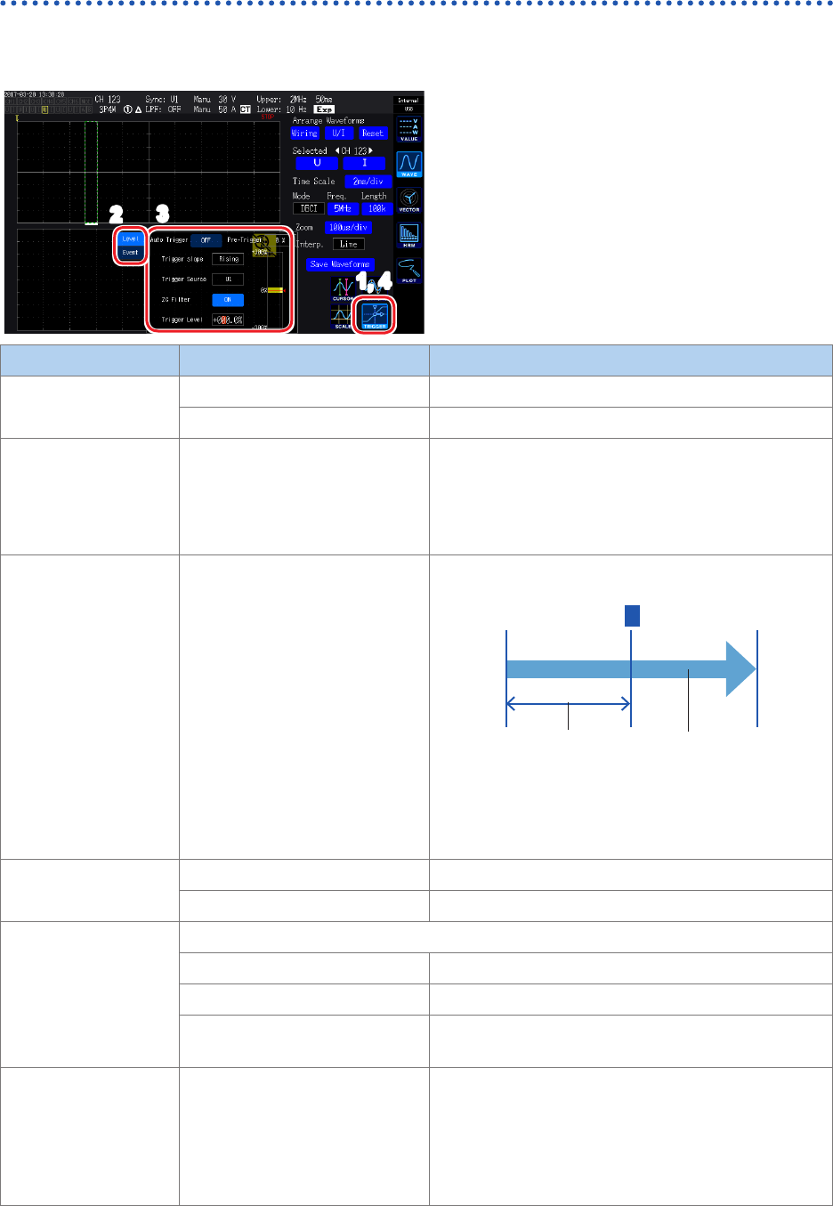 98 设置波形显示的变更与记录 触发的设置 这里所说的触发 (T rigger) ,是指用于设置波形记录开始条件的功能。 将触发中设置的条件成立并开始波形记录称之为 “进行触发” 。 1, 4 3 2 1 触摸 TRIGGER 触发设置窗口打开。 2 选择触发检测方式 ( Level / Event ) 。 3 触摸并选择各项目 4 触摸 TRIGGER 窗口关闭。 项目 选择项目 内容 触发检测方式 Level (电平) 通过存储波形…