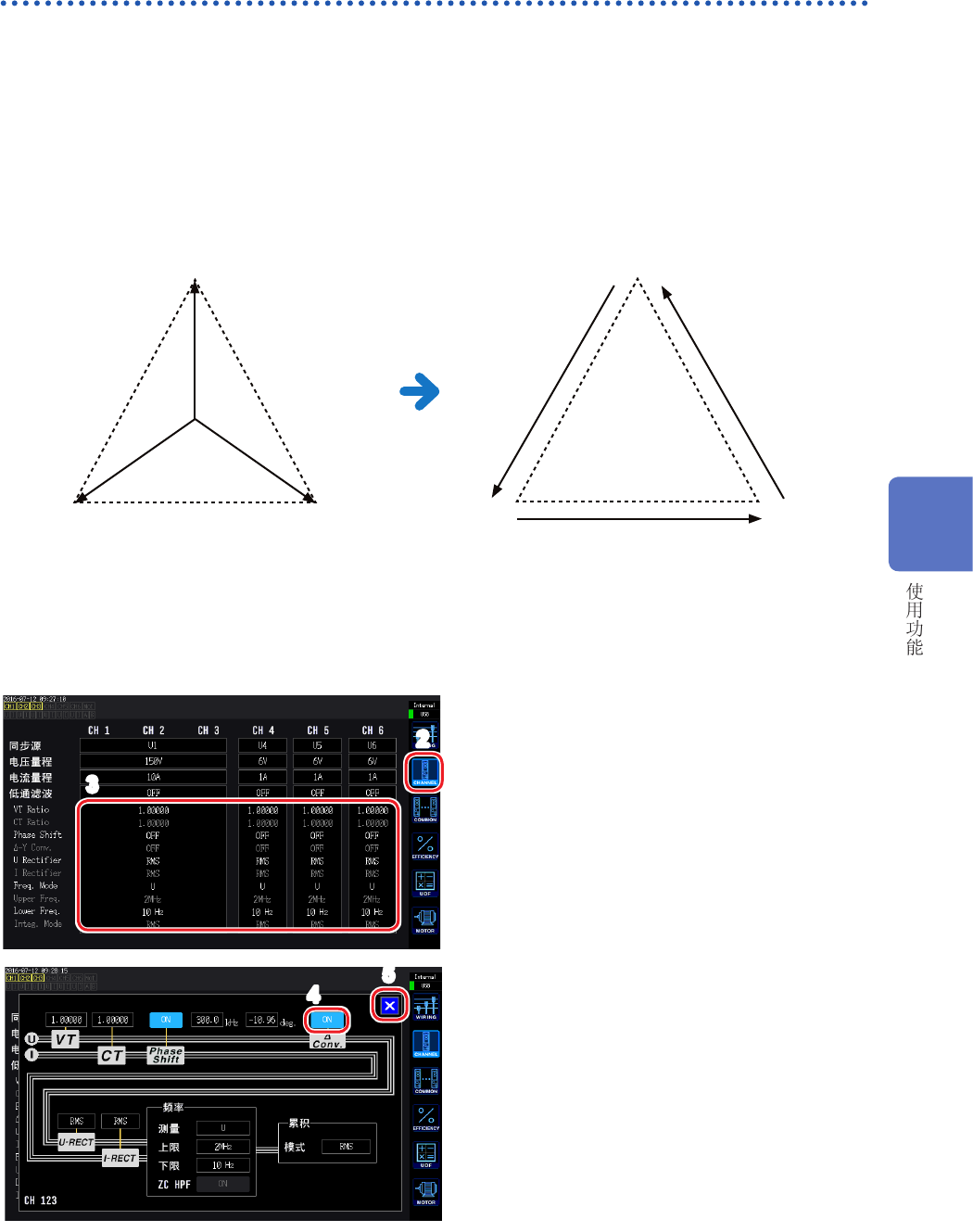 是指相互转换三相测量线路的三角接线与Y接线(星形接线)进行测量的功能。根据通过不同通道之