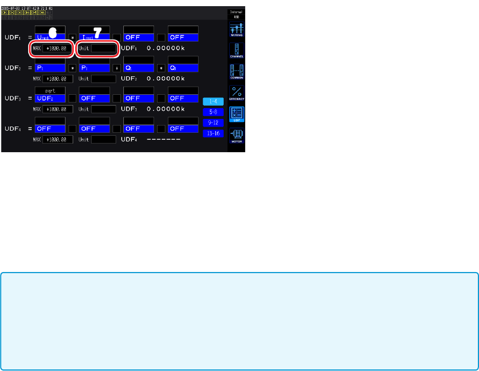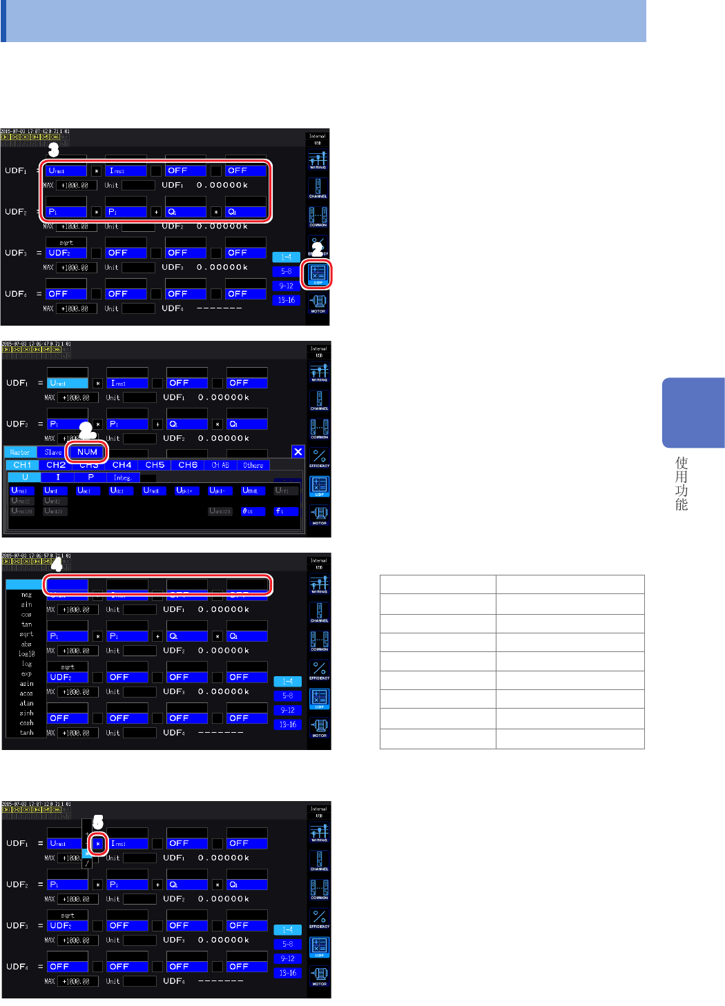 125 用户定义运算 (UDF) 5.7 用户定义运算 (UDF) 可组合本仪器的测量值、数值与函数设置运算公式。 可在测量画面中显示已设置的运算值,或使用已设置的运算值类进行运算。 2 3 1 按下 [INPUT] 键 2 触摸 UDF 选择项目 : UDF1 ~ UDF16 ( 16 项) 2. 3 触摸项目名 1 . 基本测量项目选择窗口打开。 2 . 进行触摸,以选择项目。 • 也可以选择已设置的 UDF • 也可以输入数值 (…